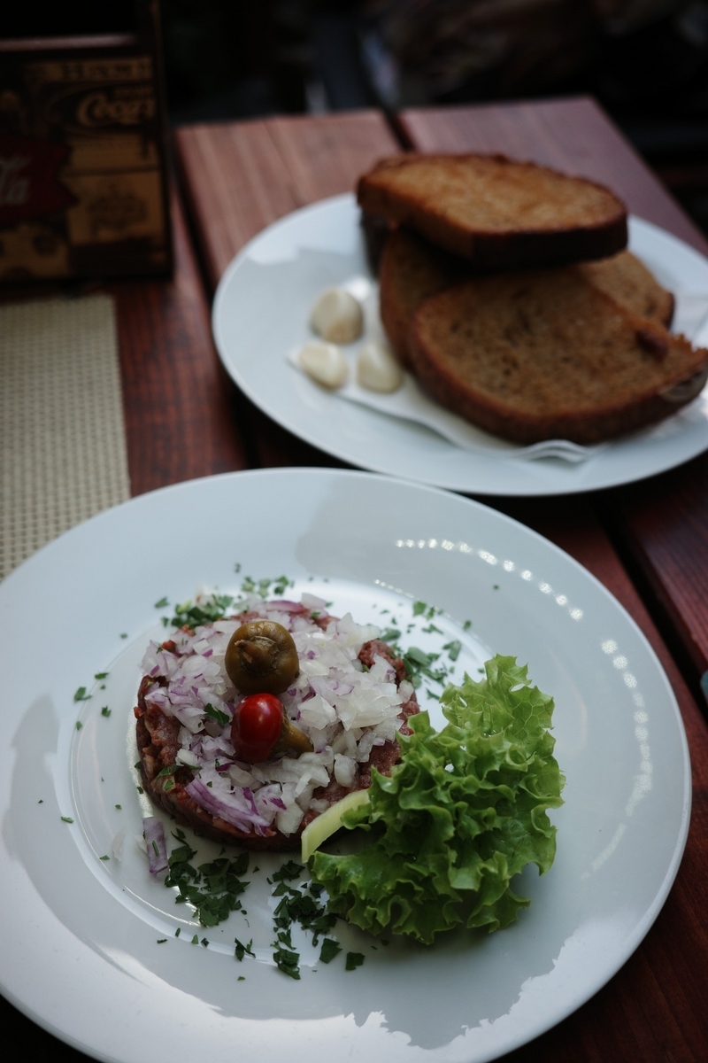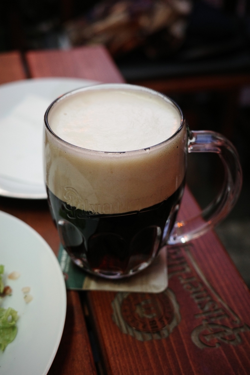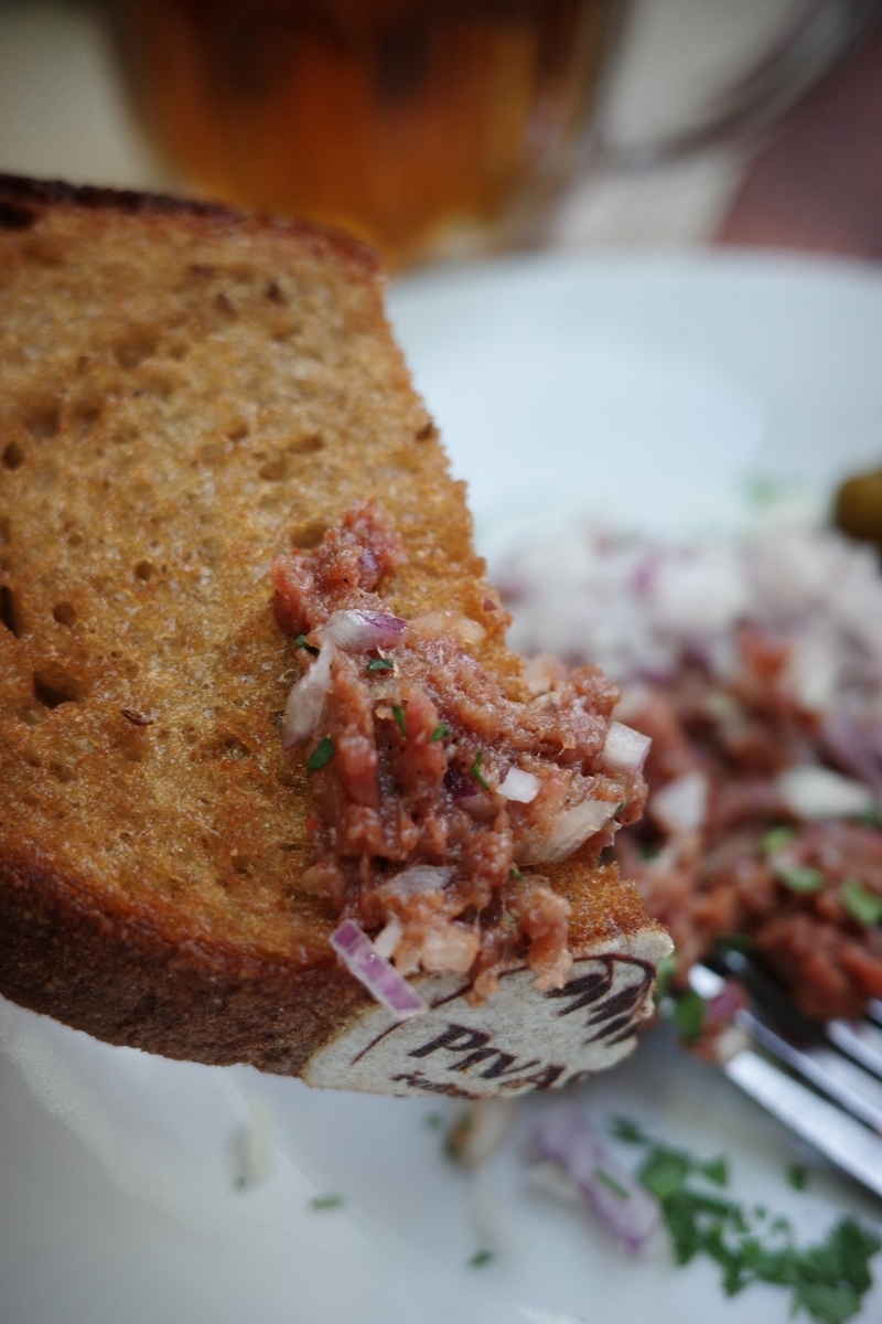 まずはバゲットをおろし金がわりに生のニンニクをすりおろす。もうこれだけでもおいしいところに、ビーフタルタルをディップして食べる。言うまでもないがこれがビールに合う。空のグラスをウエイターに掲げて3杯目を要求する。それも飲み干して次は黒ビールをオーダー。甘くておいしい。